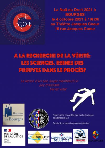 Dans le cadre de la « Nuit du Droit » instituée par le Conseil constitutionnel, le barreau de Bourges a proposé d'organiser une soirée au théâtre "Jacques Coeur" de Bourges. Le tribunal judiciaire de Bourges, le groupement de gendarmerie du Cher, la compagnie des experts près la cour d'appel de Bourges, les commissaires de justice et le CDAD du Cher ont adhéré, avec enthousiasme, au projet, certains acceptant de jouer leur propre rôle dans cette reconstitution théâtrale.
