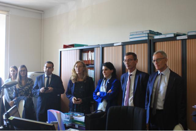 Puis Madame la ministre a rejoint les locaux du service administratif interrégional, où l'attendait Madame Patricia MARTIN, sa responsable, ainsi que l'équipe des directeurs des services de greffe qui s'y trouvent affectés. À cette occasion, son attention a été appelée sur les nombreuses missions incombant actuellement au service de la gestion des ressources humaines et un point a été fait sur l'état de la transition numérique dans le ressort de la cour.