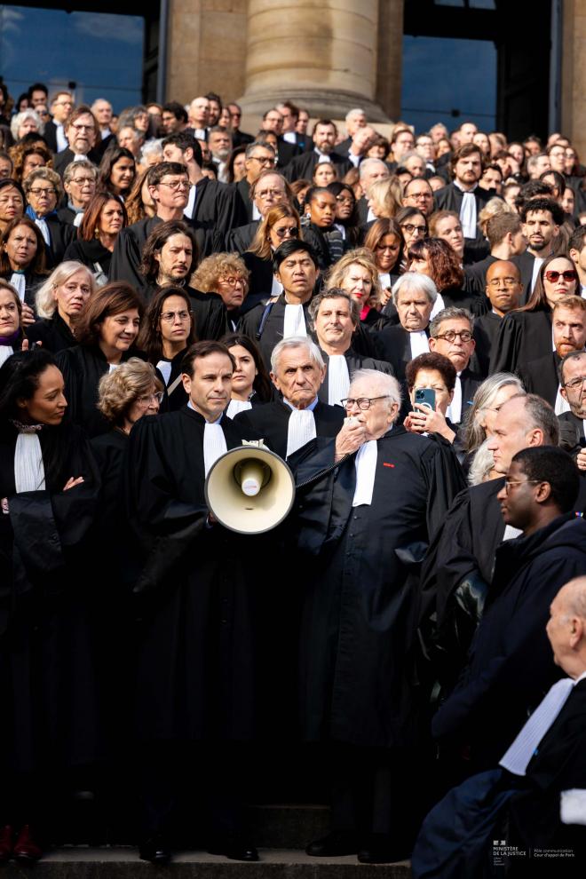Sur les marches historiques de la cour du Mai, le premier président de la cour d’appel, le bâtonnier de Paris, la vice-bâtonnière et son confrère et ami, Maître Leclerc, ont pris la parole pour rendre un vibrant hommage à l’ancien garde des Sceaux et avocat.